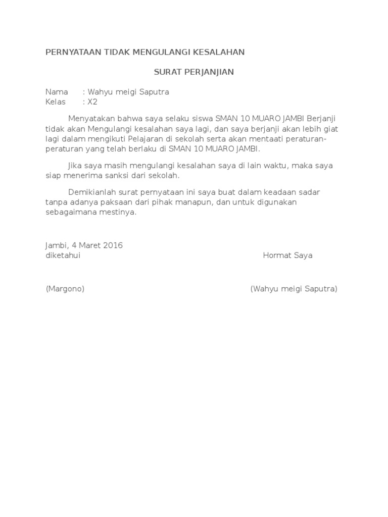 Download Contoh Surat Perjanjian Siswa Tidak Mengulangi Kesalahan from contohsuratlengkap.org 99 macam contoh surat pernyataan berbagai keperluan yang baik dan benar lengkap. Contoh surat pernyataan adalah surat yang digunakan untuk menyatakan sesuatu kepada penerima. Contoh dan cara membuat surat pernyataan tidak akan mengulangi kesalahan tutup kurung. Pernyataan bersedia ditempatkan di mana saja. Contoh surat pernyataan berjanji tidak mengulangi kesalahan. Surat pernyataan kesalahan adalah sebuah surat yang dibuat seseorang yang mana dia menyatakn bersalah telah melakukan sesuatu. Contoh surat pernyataan tidak mengulangi kesalahan. Berikut tadi adalah 1 contoh surat pernyataan kesalahan dari kami kita akan memberikan contoh surat lain pada.